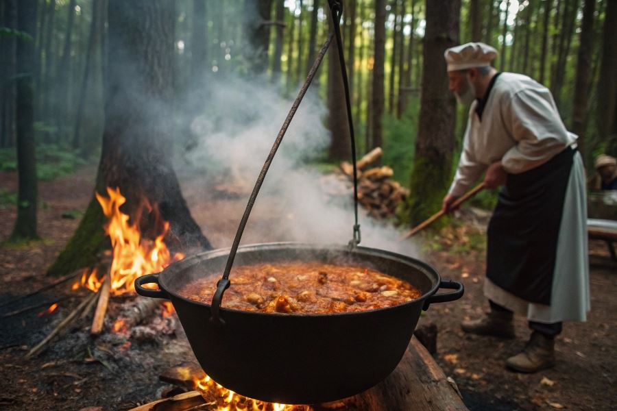 „Bigos myśliwski najlepiej smakuje, gdy gotuje się przez wiele godzin w kociołku zawieszonym nad ogniskiem z drewna dębowego lub bukowego” – fragment z XVIII-wiecznego poradnika kulinarnego.