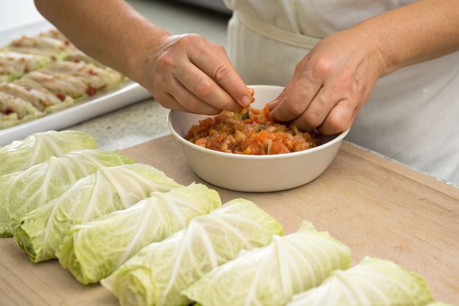 - Umieść farsz w centralnej części liścia (około 2-3 łyżki)