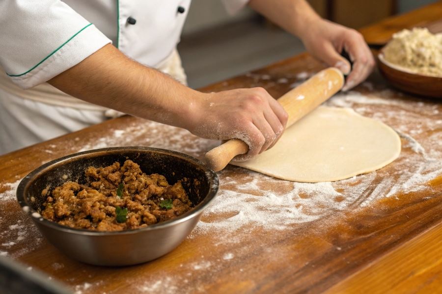 Sekret doskonałych czebureki tkwi w odpowiednio przygotowanym nadzieniu mięsnym. Najlepsze proporcje to 70% wołowiny i 30% tłustej wieprzowiny, które zapewniają idealny balans smaku i soczystości. Mięso powinno być drobno posiekane nożem, nie mielone – zachowuje wtedy lepszą strukturę i uwalnia więcej soków podczas smażenia.