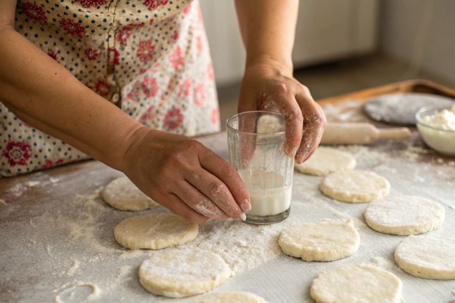 - Zdecydowanym ruchem wycinaj kółka, dociskając szklankę do blatu