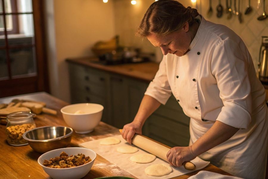 2. Podwójne wałkowanie – najpierw na grubość 3-4 mm, następnie odpoczynek 5 minut i ponowne wałkowanie na 2 mm