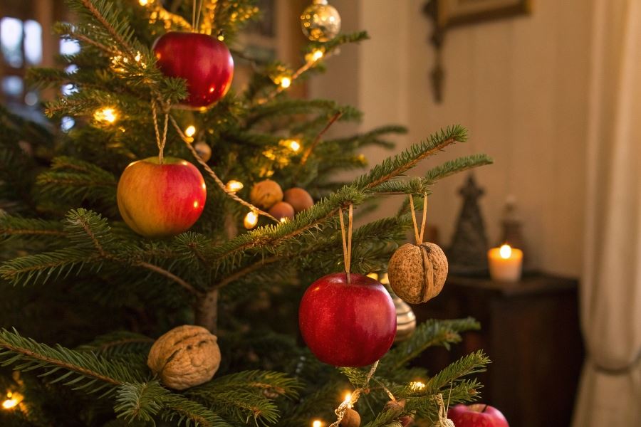 Owoce jako ozdoby choinkowe mają w Polsce szczególne znaczenie. Jabłka, często malowane na złoto lub czerwień, symbolizują rajski owoc i zdrowie. Suszone śliwki, gruszki i morele nawlekane na nitki tworzyły naturalne łańcuchy. Orzechy włoskie i laskowe, czasem owijane w sreberka, reprezentowały dostatek i mądrość.