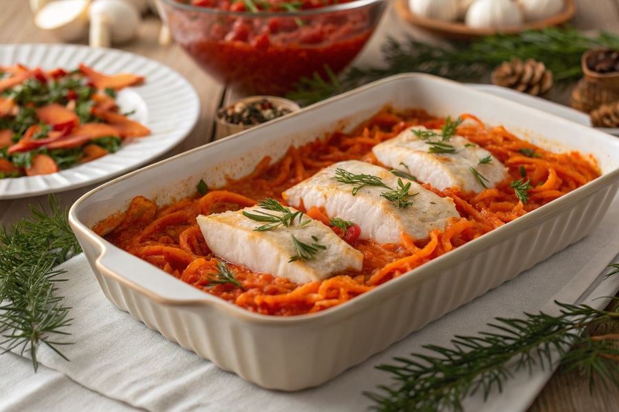 Łosoś to doskonała alternatywa dla tradycyjnego dorsza w rybie po grecku. Jego intensywny smak i charakterystyczny różowy kolor nadają daniu nowy wymiar. Tłuste mięso łososia doskonale komponuje się z warzywami w sosie pomidorowym, tworząc bardziej wyrazistą wersję tego wigilijnego przysmaku. Warto pamiętać, że łosoś wymaga krótszego czasu gotowania – wystarczy 5-7 minut, aby zachować jego soczystość.