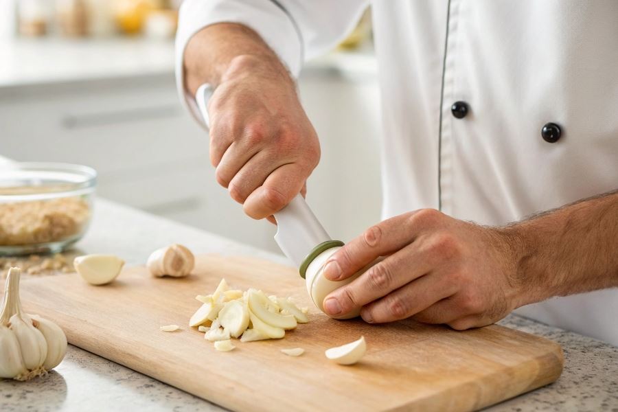 „Profesjonalni szefowie kuchni przygotowujący duże ilości czosnku często stosują metodę dwóch misek. Umieszczają obrane ząbki między dwiema metalowymi miskami i energicznie potrząsają przez 30 sekund. To pozwala obrać nawet 3 główki czosnku w minutę” – Marek Wiśniewski, szef kuchni restauracji Zielona Oliwka.