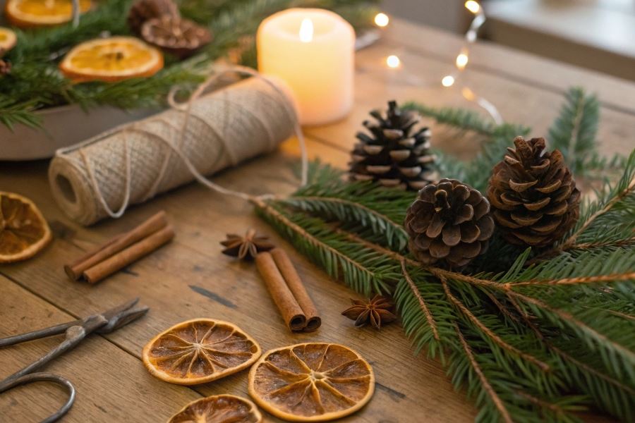 Stworzenie magicznej atmosfery świątecznej nie wymaga dużych nakładów finansowych. Szyszki sosnowe i świerkowe stanowią doskonałą bazę dekoracyjną – wystarczy je pomalować farbą akrylową w kolorze złotym lub srebrnym, a następnie obsypać brokatem. Suszone plastry pomarańczy i jabłek nie tylko pięknie wyglądają, ale również wypełniają dom świątecznym aromatem. Można je nawlec na sznurek konopny tworząc naturalne girlandy.
