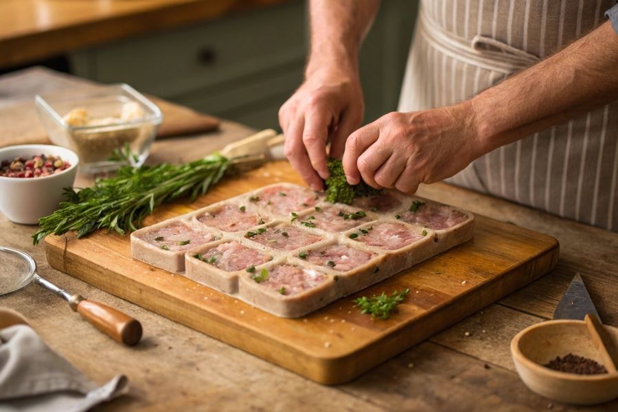 Po ugotowaniu i ostudzeniu głowizny następuje pracochłonny etap oddzielania mięsa od kości. Mięso kroimy w kostkę lub drobno siekamy, zachowując różnorodną teksturę. Do masy mięsnej dodajemy: