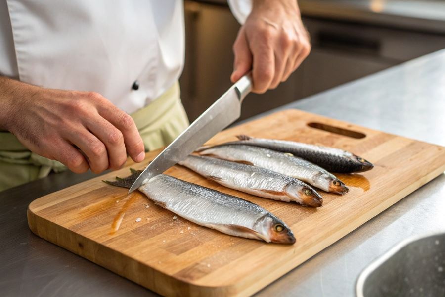 Odpowiednie przygotowanie stanowiska pracy ma kluczowe znaczenie – oprócz ostrego noża i pęsety, warto zaopatrzyć się w miskę na odpadki oraz wilgotny ręcznik do wycierania rąk, co zapobiega ślizganiu się ryby podczas obróbki.