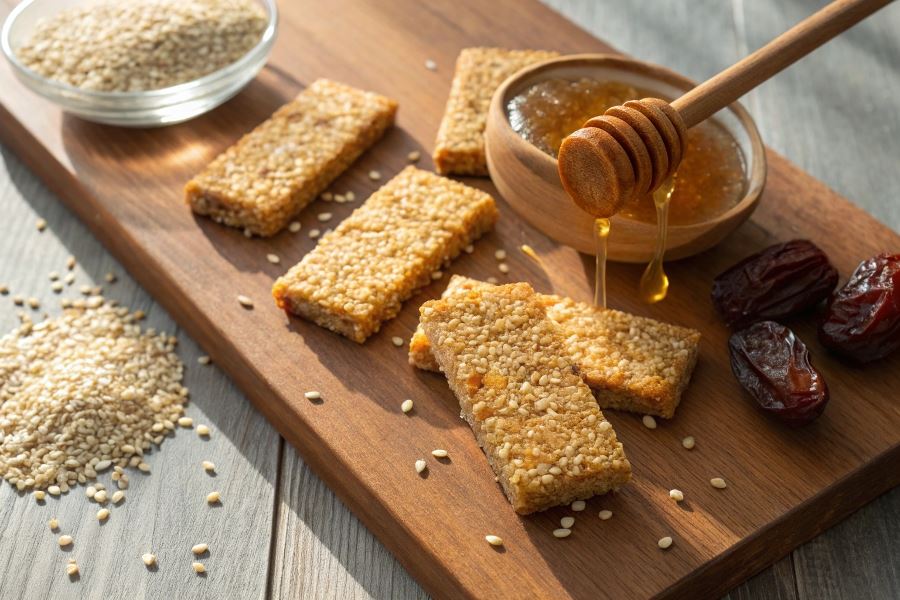 • Syrop daktylowy – naturalny słodzik o niższym indeksie glikemicznym niż cukier, bogaty w składniki mineralne. Nadaje sezamkom głęboki, karmelowy smak i ułatwia ich formowanie dzięki lepkiej konsystencji.