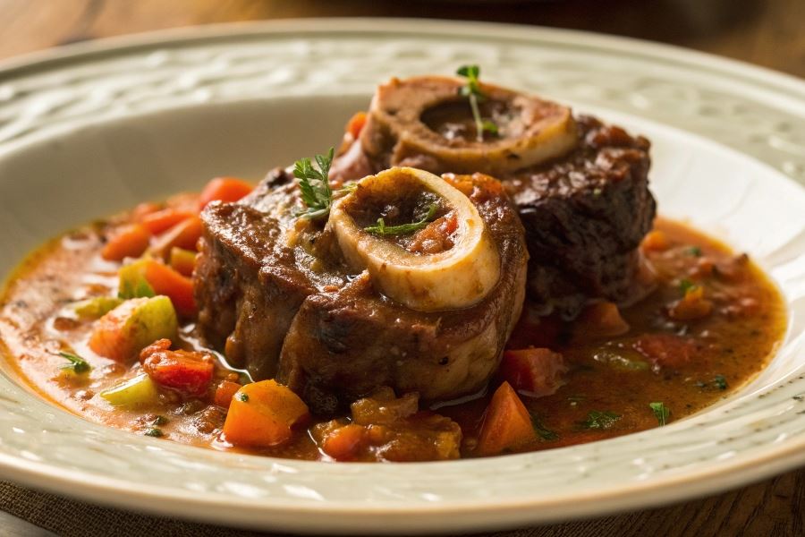 Sekret idealnego ossobuco tkwi w powolnym duszeniu – mięso powinno być tak miękkie, że dosłownie odchodzi od kości, a sos gęsty i intensywny w smaku. Tradycyjnie podaje się je z risotto alla milanese z szafranem lub polentą.