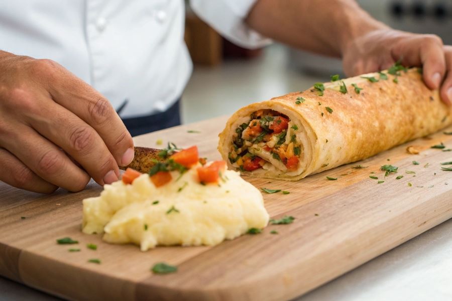 Serwowanie rolady lawaszowej z puree – kompozycja na talerzu