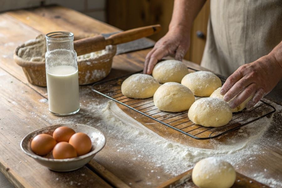 4. Formowaniu bułeczek – delikatne formowanie bez nadmiernego ugniatania, aby zachować pęcherzyki powietrza