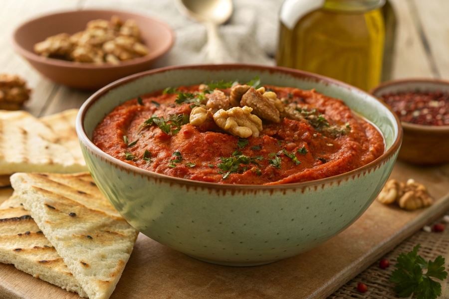 Muhammara łączy w sobie słodycz pieczonej papryki, wyrazistość orzechów włoskich i delikatną kwasowość granatu, tworząc harmonijną kompozycję smaków charakterystyczną dla kuchni śródziemnomorskiej.