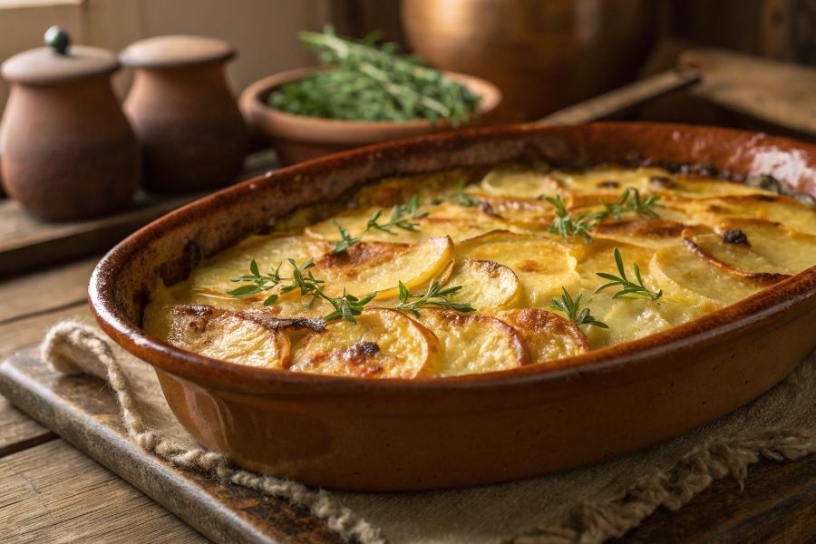 Kluczowym momentem jest sprawdzenie gotowości potrawy. Wbij patyczek lub wykałaczkę w środek kartoflaka – jeśli wychodzi sucha i ziemniaki są miękkie, danie jest gotowe. Skórka powinna mieć złocistobrązowy kolor, a ser na wierzchu powinien się delikatnie zarumienić.