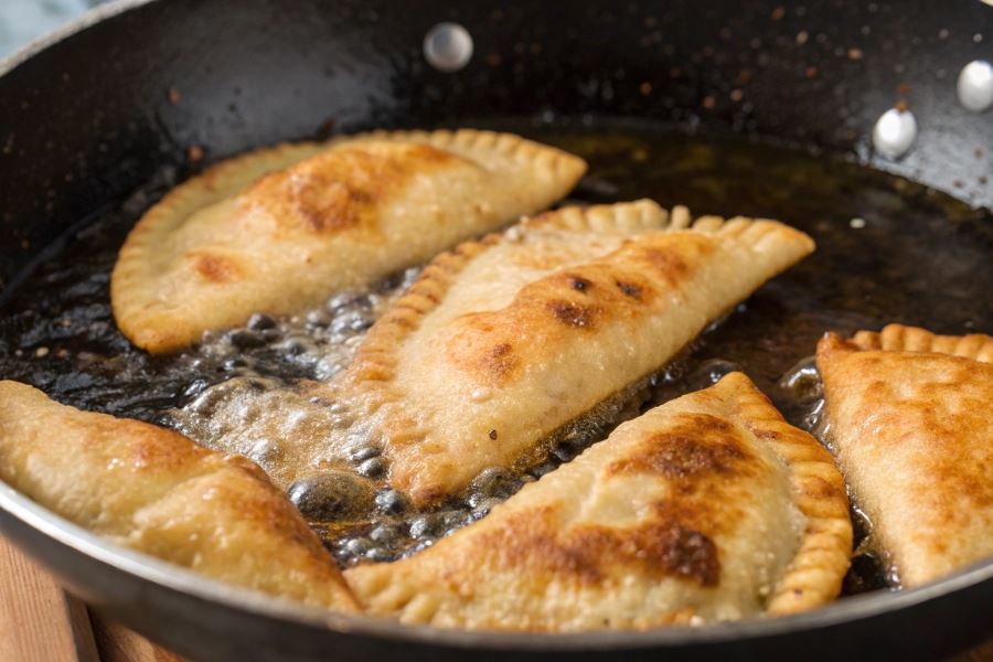 - Każdego czebureka smaż około 2-3 minuty z każdej strony, aż uzyska złoto-brązowy kolor