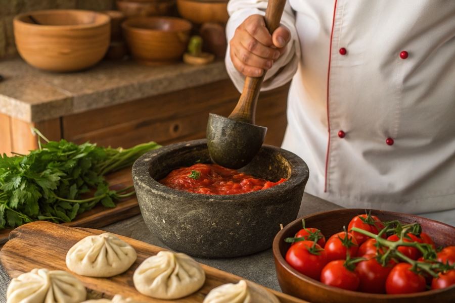 Prawdziwy sos czerwony do chinkali powinien mieć konsystencję gęstej salsy – nie za rzadką, by nie spływała z pierogów, ale wystarczająco płynną, by można było w nim maczać chinkali.