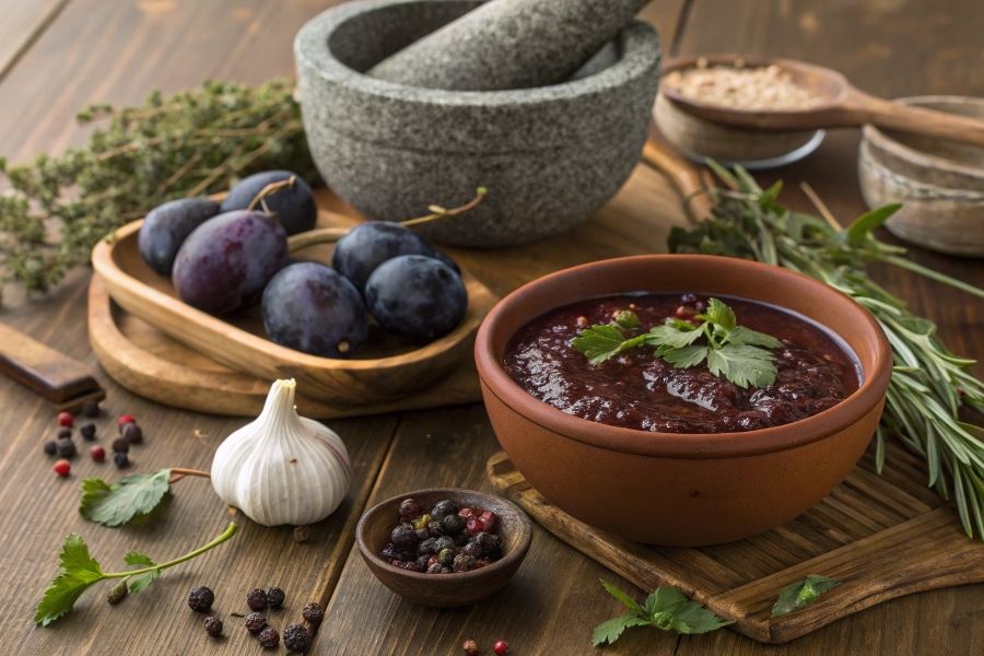 Gruzińska kuchnia słynie z bogatego wykorzystania ziół i przypraw, a sos tkemali nie jest wyjątkiem. Klasyczna receptura zawiera: