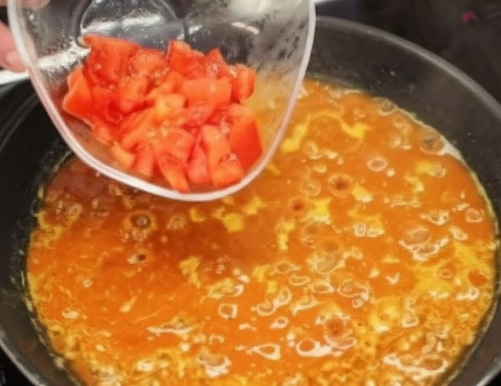 Kostki bulionu wołowego wymieszaj z ciepłą wodą, wlej do reszty. Dodaj pomidory konserwowe, gotuj pod przykryciem ok 30 min., aż połowa płynu wyparuje.