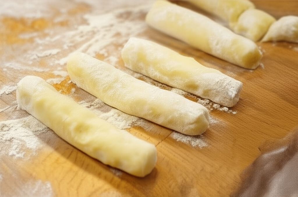 Przygotowane ciasto przełóż na obsypaną mąką stolnicę i rozdziel na kilka identycznych części. Każdą uformuj w wałek i pokrój go nożem na mniejsze porcje.