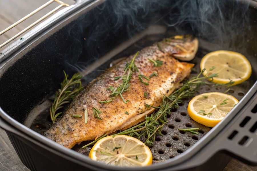 Cyrkulacja gorącego powietrza w airfryerze tworzy efekt podobny do pieczenia, ale z szybkością zbliżoną do smażenia. Mięso pstrąga pozostaje soczyste wewnątrz, podczas gdy skórka zyskuje przyjemną chrupkość.
