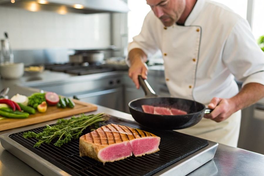 Kluczem do idealnego steku z tuńczyka jest ekstremalnie wysoka temperatura – patelnia powinna być rozgrzana do punktu, w którym olej zaczyna delikatnie dymić. Tylko wtedy możliwe jest uzyskanie pożądanego efektu sear – szybkiego zamknięcia soków wewnątrz mięsa przy jednoczesnym zachowaniu surowego wnętrza.