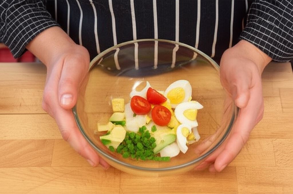 Awokado obierz i pokrój w grubą kostkę. Cebulę dymkę posiekaj w piórka, szczypiorek i kolendrę drobno posiekaj. Pomidorki przekrój na połówki, jajka pokrój w grubą kostkę.