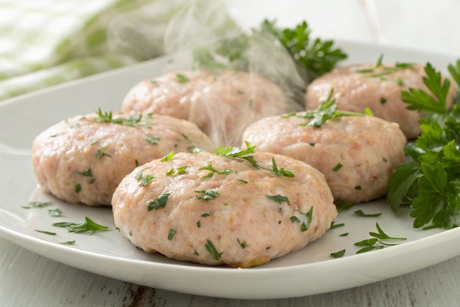Wybieraj mięso z indyka o zawartości tłuszczu około 7-10% – zbyt chude mięso sprawi, że kotlety będą suche, nawet przy gotowaniu na parze.