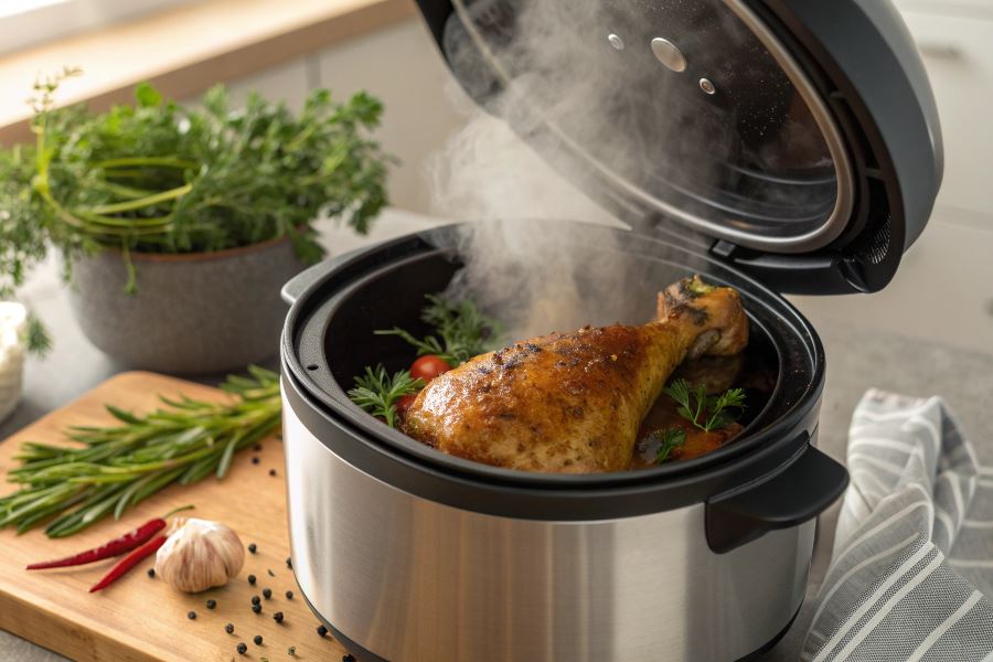 Multicooker to prawdziwy sprzymierzeniec w kuchni, gdy chodzi o przygotowanie podudzi z indyka: