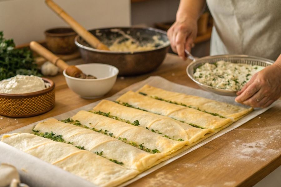 Sekret tureckiego bureka tkwi w rozwałkowaniu ciasta na bardzo cienkie płaty. Tradycyjnie używa się długiego wałka zwanego oklava, ale w warunkach domowych wystarczy zwykły wałek kuchenny. Każdą kulę rozwałkuj na blacie posypanym skrobią kukurydzianą (nie mąką!) do grubości niemal przezroczystej.