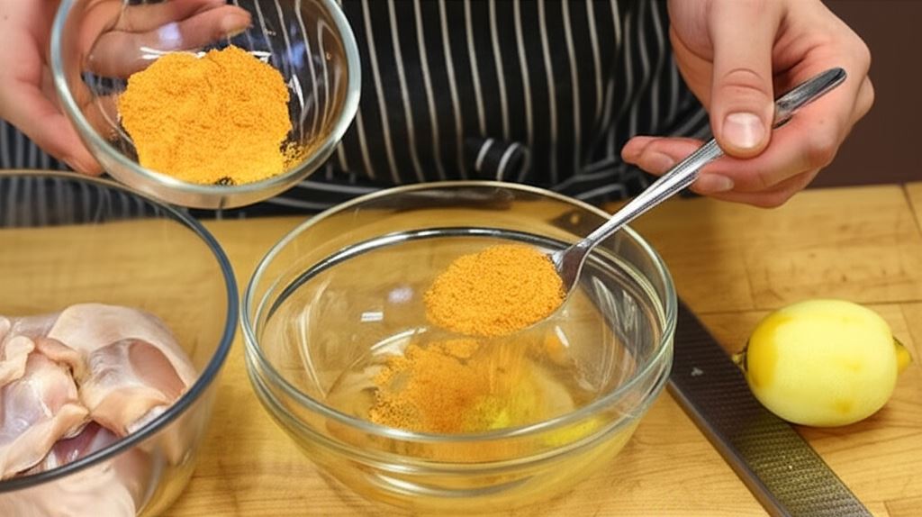 Zetrzyj skórkę z cytryny, wyciśnij sok. Skórkę wymieszaj z przyprawą do kurczaka i olejem. Uzyskaną marynatą natrzyj mięso, włóż je na parę godzin do lodówki.