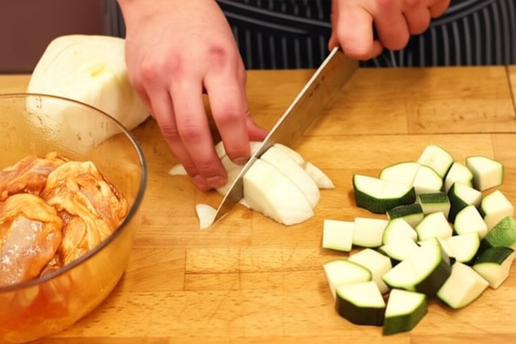 Pokrój koper i cukinię na grubą kostkę o wymiarze 2-3 cm.
