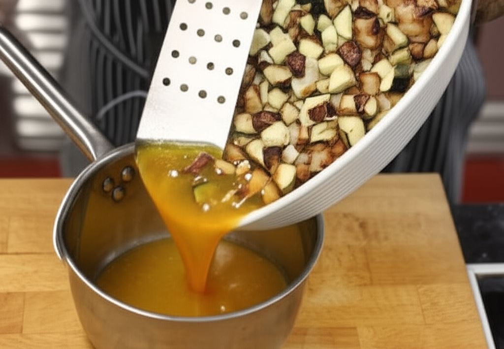 Kurczaka oraz warzywa umieść w misce, z naczynia odlej pozostały sos po pieczeniu i wlej do garnka.