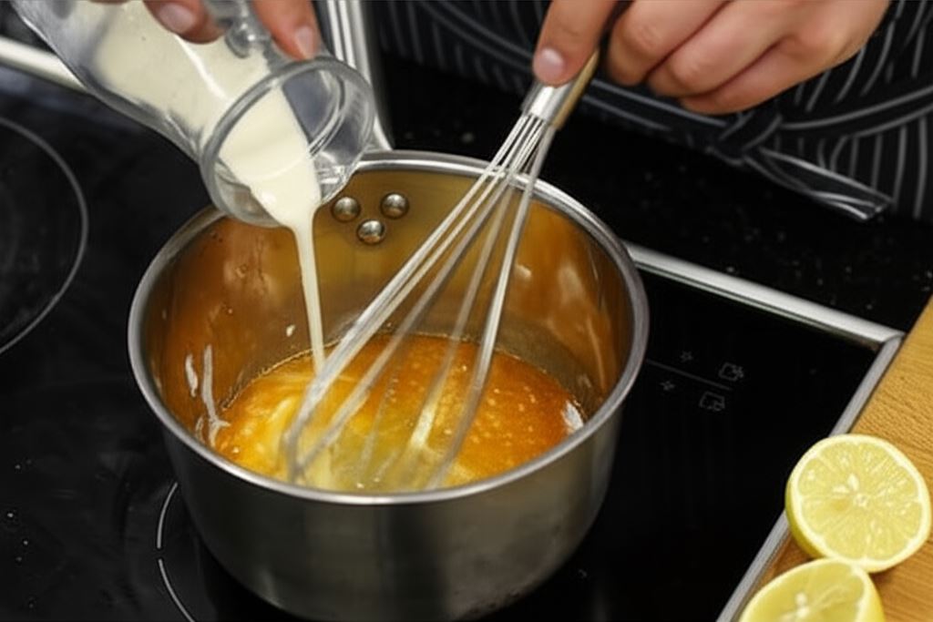 Do bulionu wlej mleko wymieszane z mąką. Sos gotuj do zgęstnienia, dopraw na końcu sokiem z cytryny, przelej ponownie do kurczaka.