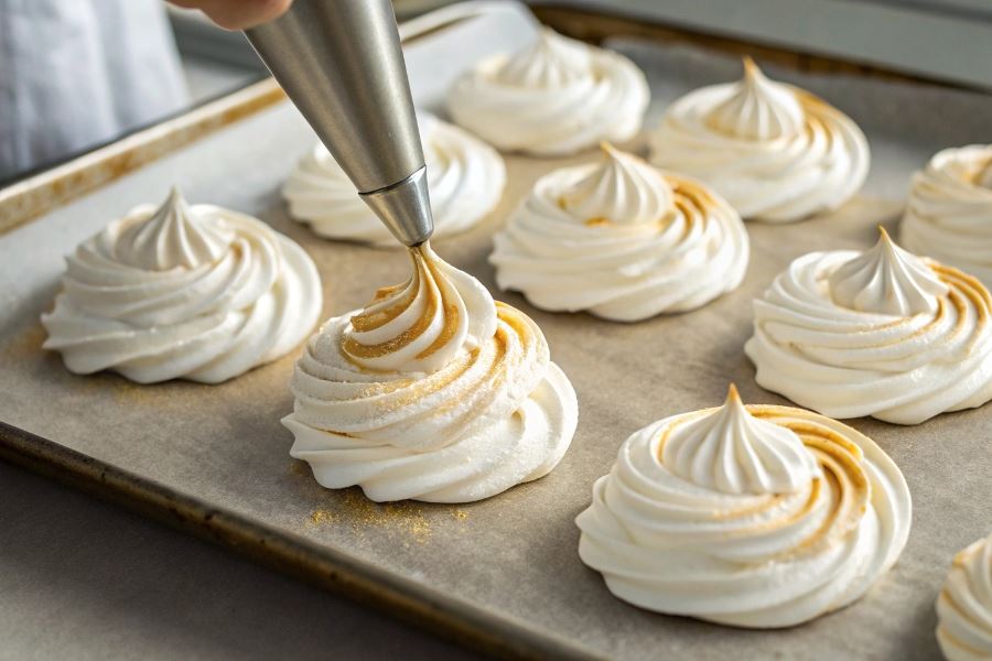 - Za pomocą rękawa cukierniczego lub łyżki formuj bezy na blasze