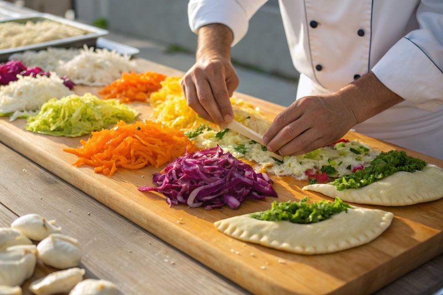 Bezmięsne czebureki zyskują na popularności dzięki bogatym kompozycjom smakowym. Podstawą tradycyjnego farszu warzywnego jest połączenie drobno posiekanej cebuli, startej marchwi i kapusty. Cebula nadaje słodycz i głębię smaku, marchew wprowadza delikatną słodycz, a kapusta zapewnia odpowiednią strukturę. W firmie PrimeCook stosujemy wyłącznie świeże warzywa do naszych półproduktów, co gwarantuje zachowanie pełni aromatu.
