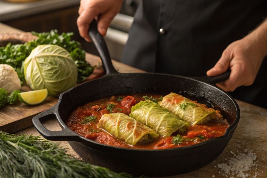 Główkę kapusty sparz wrzątkiem lub podgotuj przez 5 minut, aby liście zmiękły. Oddziel delikatnie liście i usuń twarde części. Na każdy liść nałóż porcję farszu i zawiń, formując luźne pakieciki.
