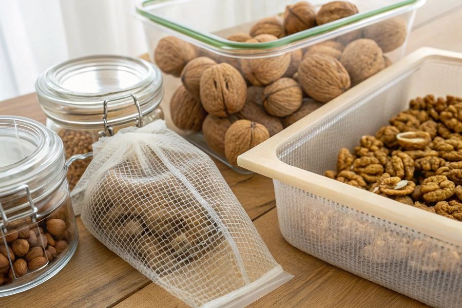 Unikaj szczelnie zamkniętych plastikowych pojemników, które sprzyjają kondensacji wilgoci i rozwojowi mikroorganizmów. W odpowiednich warunkach orzechy włoskie w łupinach zachowują świeżość nawet do 12 miesięcy.
