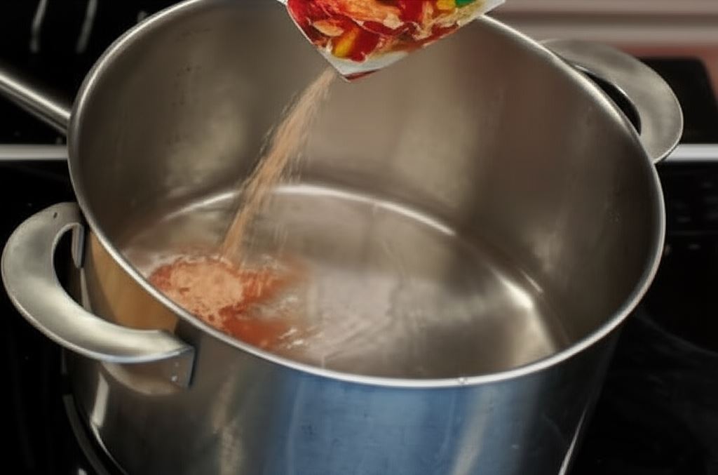 Roztop Fix Knorr w 600 mililitrach chłodnej wody, potem starannie zamieszaj, doprowadź do wrzenia i gotuj przez następne 5 minut.