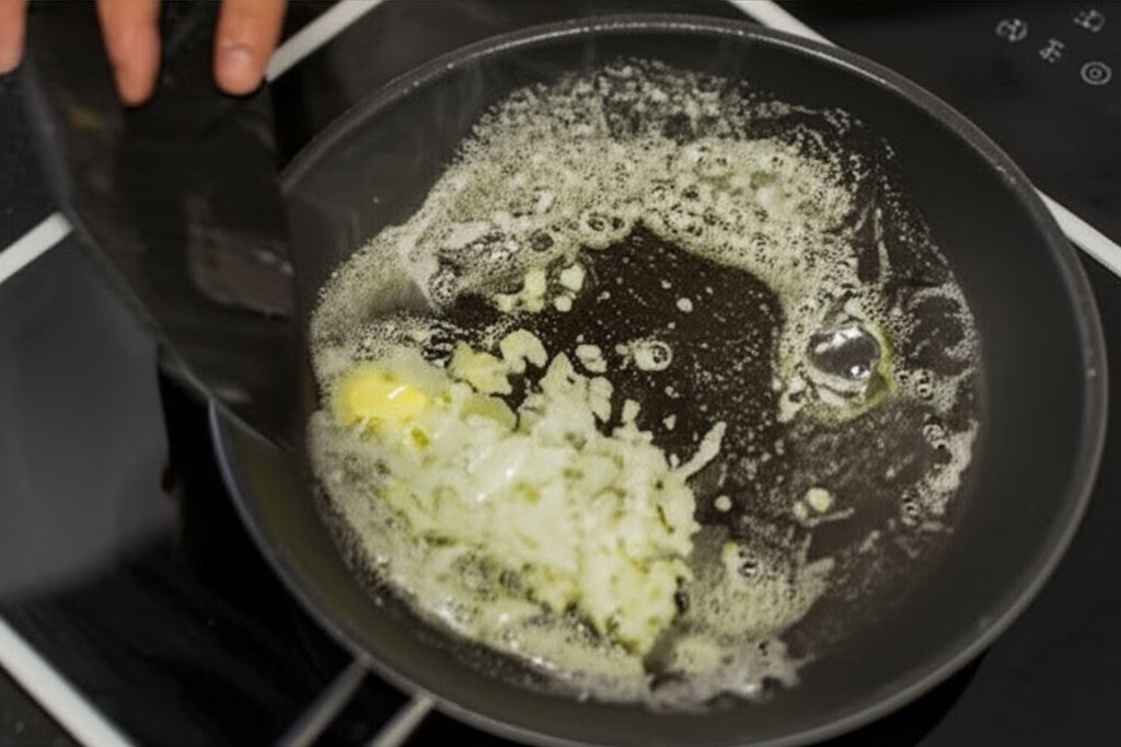 Na patelni roztop tłuszcz i podsmażaj moment posiekany czosnek, cebulę oraz imbir.