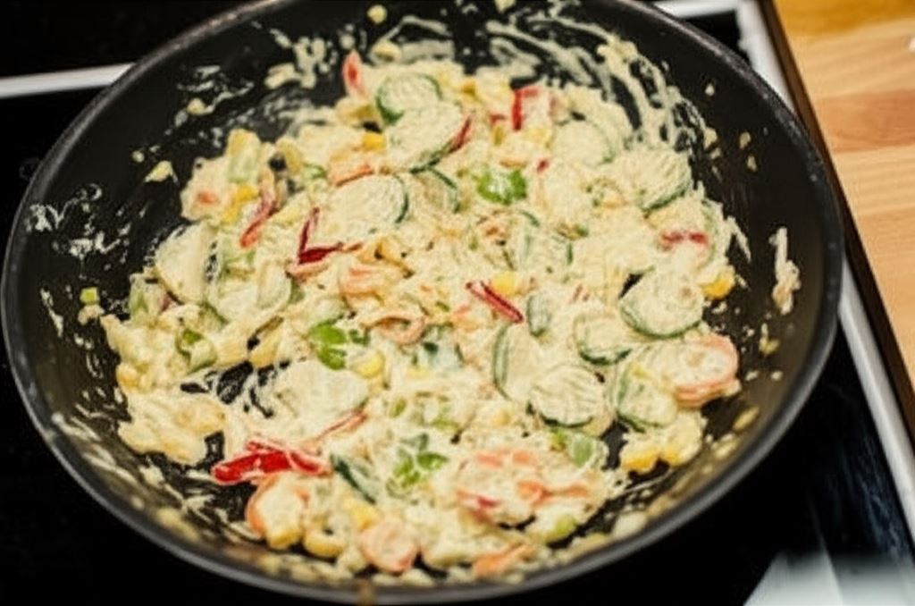 Wymieszaj wszystko starannie i gotuj około 2 minuty, dopóki sos nie stanie się kremowy. Podawaj od razu po przyrządzeniu, razem z ryżem. Do warzyw możesz także dodać zielony groszek.