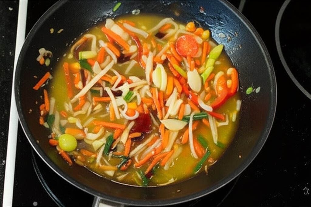 Rozgrzej olej sezamowy na patelni lub w garnku, wsyp posiekany imbir, ząbek czosnku i posiekane chili. Smaż przez moment.