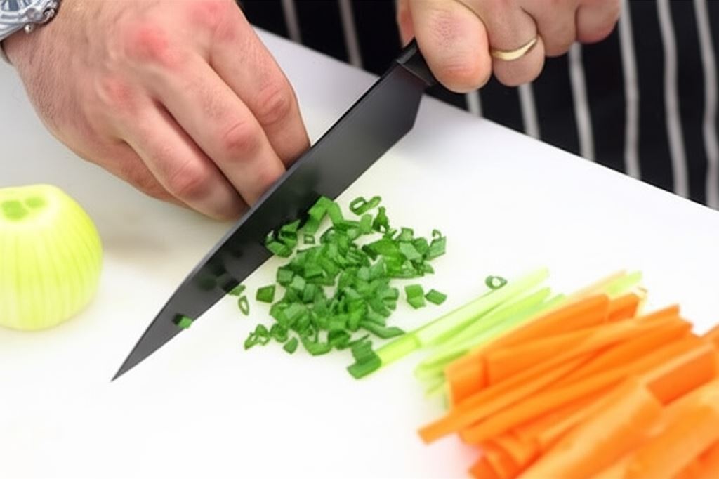 Potnij marchew i selera na słupki o długości 5 cm. Posiekaj cebulę razem ze szczypiorem, który zachowaj na później.