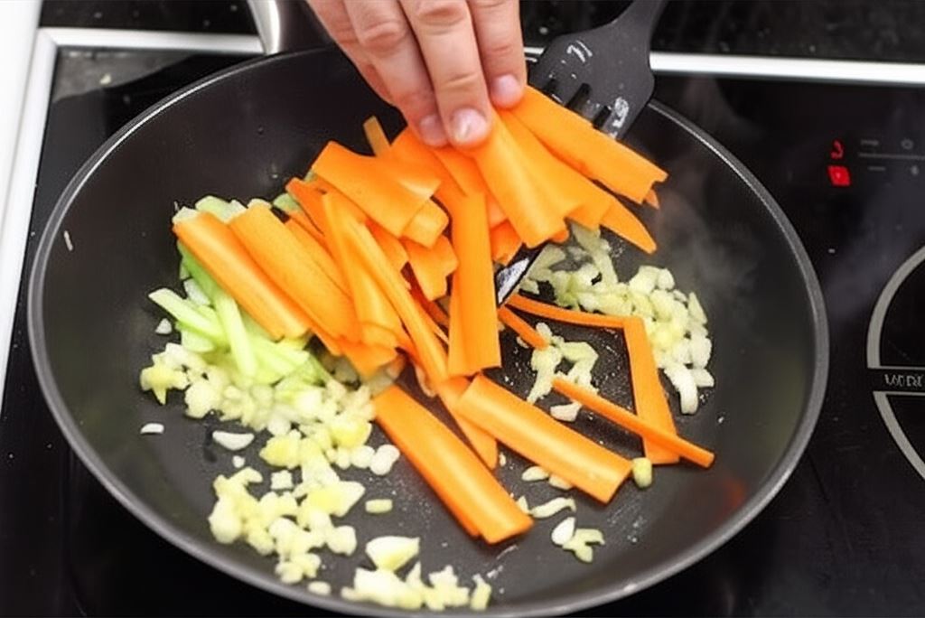 Obsmaż na gorącym oleju sezamowym pokrojone warzywa.