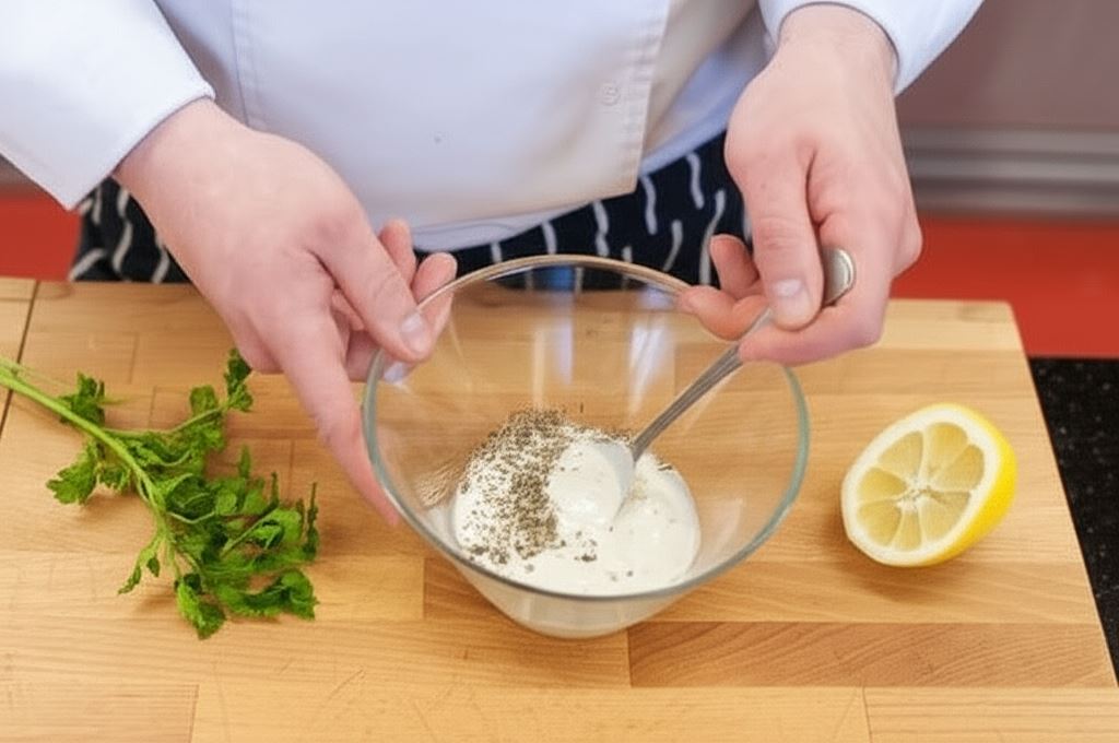 W miseczce połącz sos Hellmann's z jogurtem, wlej sok z cytryny, wsyp zioła i dodaj posiekaną natkę. Dip przypraw według uznania i serwuj z warzywnymi paluszkami jako przekąskę. Tip: Podczas czyszczenia warzyw zwróć szczególną uwagę na seler, ponieważ trzeba go starannie oczyścić z włókien.
