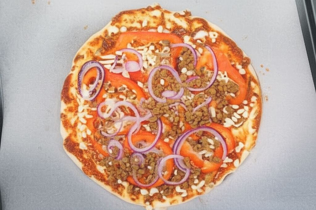 Sekret tej pizzy tkwi w idealnie wyważonych proporcjach i starannie dobranych składnikach. Delikatnie wyrośnięte ciasto stanowi doskonałą bazę dla intensywnego sosu pomidorowego, a kolorowe warzywa – papryka, cebula i ogórek – dodają świeżości i chrupkości. Roślinne mięso mielone oraz wegańska alternatywa sera dopełniają całości, tworząc prawdziwie wiejski charakter tej pizzy.