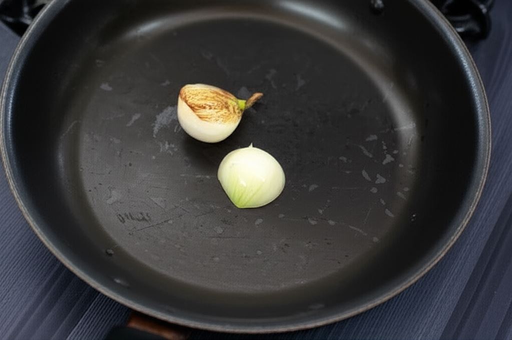 Warzywa opłucz i obierz. Cebulę przekrój na połowę i przypal na patelni.