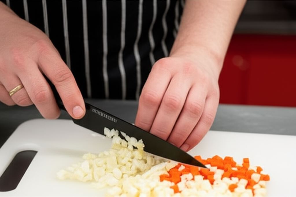 Pokrojone obrane warzywa posiekaj w małą kostkę. Potem wrzuć do garnka z wodą warzywa, przysmażoną cebulę, liść laurowy, ziele angielskie oraz kostki Rosołu na włoszczyźnie Knorr. Gotuj przykryte przez około 20 minut na wolnym ogniu.