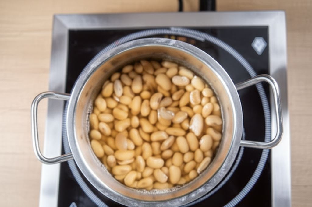 Białą fasolę mocz w zimnej wodzie przez noc, kolejnego dnia zalej ją świeżą wodą, wsyp ziele angielskie i liść laurowy, dodaj sól i gotuj aż zmięknie. Wody po gotowaniu nie odlewaj.