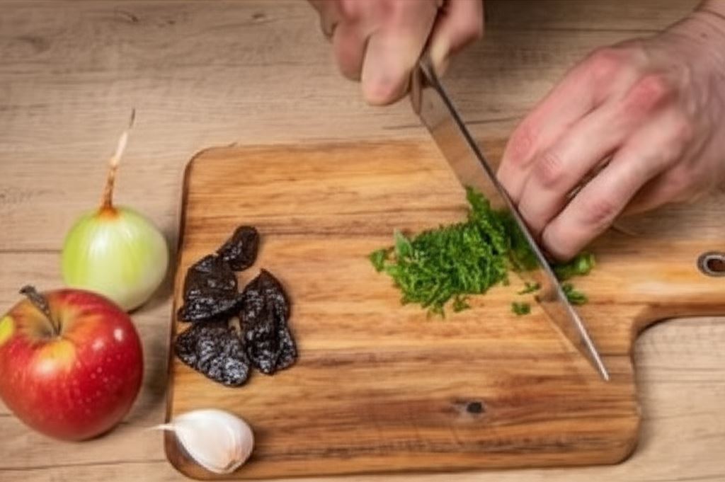 Cebulę i jabłko posiekaj w drobną kostkę (jabłko możesz również zetrzeć na tarce). Śliwki jeśli to możliwe pokrój także jak najdrobniej. Czosnek i natkę lubczyku posiekaj na drobno.