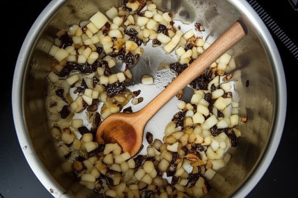 Na rozgrzanej oliwie w garnku zrumień lekko cebulę, wsyp jabłko, czosnek i śliwkę, a następnie odstaw całość do ostygnięcia.