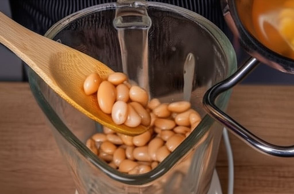 Fasolę wraz z częścią wody przenieś do naczynia miksera i starannie zmiksuj ( w razie konieczności dolej więcej wody pozostałej po gotowaniu fasoli.